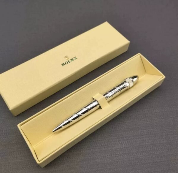 – **Premium Craftsmanship:** The pen showcases a finely detailed barrel, adorned with the Rolex logo, and is made from high-grade silver.